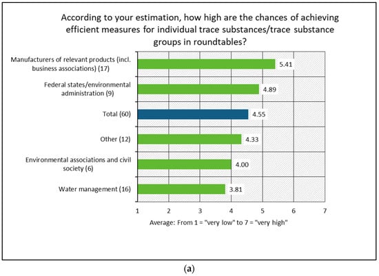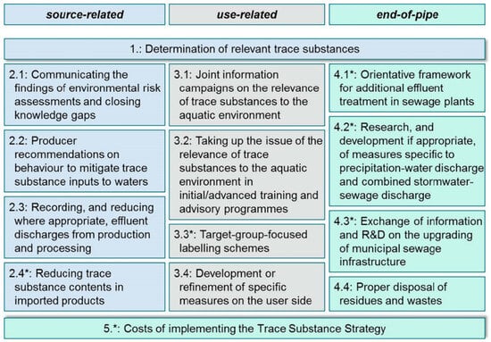 For a holistic and precautionary solution, policy mixes need to be established that target information gaps and integrate the specifics of the different sectors []. In 2015, the German Environment Agency (Umweltbundesamt, UBA) published a study on “measures to reduce micropollutant emissions to water.” The primary objective of this study was to develop suitable and highly cost-effective measures or combinations of measures and general conditions to reduce the emission of micropollutants into water via the municipal wastewater system [].