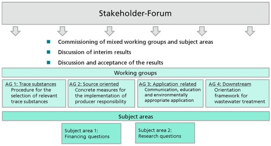 From the beginning, the role of the German Environment Agency within the stakeholder dialogue was under discussion. On the one hand, with their broad experiences on micropollutants, evaluation of their findings in water bodies, technologies to remove them and instruments to reduce them at the source or downstream, representatives of the Agency contributed essential information on different topics within the dialogue. On the other hand, the Agency made clear that it was not a stakeholder within the process and would not be part of the formal decision process on results and products (policy papers) of the dialogue. Thus, the Agency would not be bound by decisions of the stakeholders. This enabled the Agency to keep its scientific independence and to evaluate the results of the stakeholder dialogue during the entire process. As its legal task is to give advice to the Federal Ministry of Environment, the Agency published its own recommendations for reducing micropollutants in waters in 2018 to give scientific input to the dialogue []. From these, it can be seen that in the view of the Agency, voluntary agreements alone will not be enough to reduce the emission of micropollutants into waters to a sufficient degree. Therefore, the Agency proposes to take additional legal and economic measures.