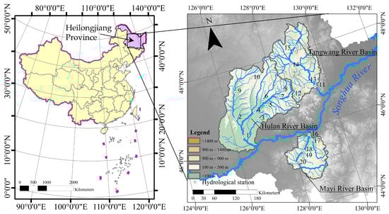 The Songhua River is located in Northeast China, between 41°42′–51°38′ N and 119°52′–132°31′ E, with a total length of 1927 km and a total area of 556,800 km2. Based on the terrain and river channel characteristics of the Songhua River, three sub-basins, the Hulan River basin, the Mayi River basin, and the Tangwang River basin, have been selected as typical basins from upstream to downstream, with their different latitudes and terrain differences. The Hulan River is the first tributary of the left bank of the midstream of the Songhua River; its basin area is about 36,800 km2. The proportion of mountainous areas and hilly and plain areas is 37% and 63%, respectively [,,]. The Mayi River is a lower-latitude first tributary on the right bank of the Songhua River; its basin area is about 10,600 km2, and it is a mountainous river. The proportion of mountainous areas and hilly and plain areas is 76.9% and 23.1%, respectively []. The Tangwang River basin is the highest-latitude first tributary among these three typical river basins, with a total area of about 20,600 km2. It has many low mountains and hills, and the mountainous area accounts for 60.1%; it is a typical mountain stream forest basin []. However, there is no hydrological station at the export of the basin. Chenming Station is closest to the export; this station is used to determine the boundary of the basin. The locations of typical basins and hydrological stations within the watershed are shown in Figure 1.