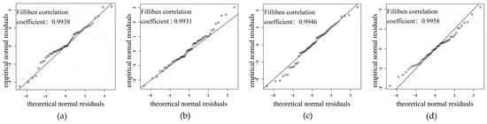 When the time sequence is nonstationary, the nonstationary model considering time covariates is used to consider the change in the statistical characteristics of the sample sequences so that the fitting results of the theoretical distribution are more accurate than the results under the stationarity assumption []. Let the explanatory variable of the location parameter or scale parameter in each distribution parameter denote time t, and solve the functional relationship between each flood variable and t, i.e., the relationship between the location parameter and scale parameter with time. The flood sequence of each station is still fitted according to the provided four distribution functions, and the optimal distribution types of Q, W1, W3, and W7 of each station are selected with the minimum value of AIC as the evaluation criterion. The parameter estimation results of the optimal distribution obtained are shown in Table 4 (taking the stations in the Mayi River basin as an example; the stations in the Hulan River basin and Tangwang River basin are shown in Appendix A.1 and Appendix A.2). In these tables, cs and pb denote that the μ/σ parameter was modeled as a cubic spline or P-splines of time or precipitation [,]. The value 1 or 2 in parentheses denotes the degree of freedom. The generalized gamma distribution is a three-parameter distribution, the shape parameter ν (shown in Section 3.2) is a constant, and ν in the distribution is omitted in this paper. Then, according to the optimal distribution of each station, their respective residual evaluation indicators were calculated. Taking the flood sequence of the Mayi River—Lianhua station as an example, the QQ-normal diagram was drawn, and the Filliben coefficient was calculated. As shown in Figure 2.