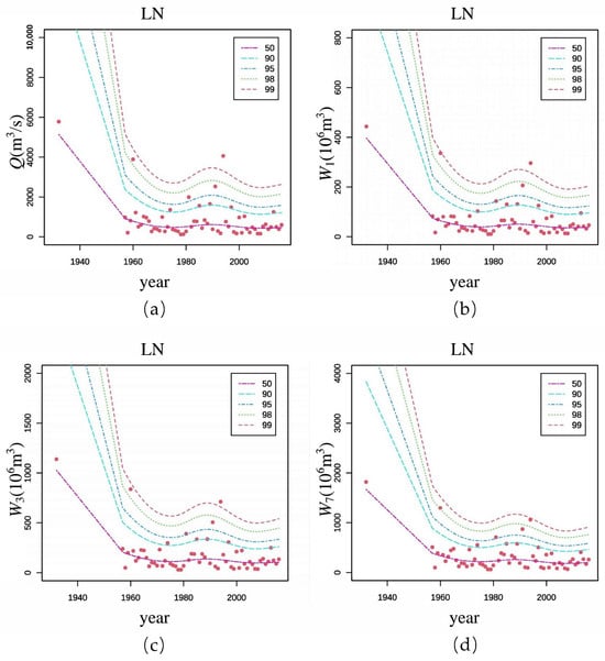 The optimal theoretical distribution of the Mayi River—Lianhua station, as determined by time-covariate GAMLSS, is used to calculate various centile curves. We are more interested in the centiles of the cumulative probability of the measured points (50%, 90%, 95%, 98%, and 99%, correlating to the exceedance probability of (1–50%), (1–90%), (1–95%), (1–98%), and (1–99%)) because the sequences that we study are flood sequences. Figure 3 displays the centile curves for the theoretical distribution of the flood extremum sequence of the fitted models (Appendix A.3 displays the centile curves plots for other stations). As shown in Figure 3, there is good agreement between the distribution of the measured scatters and the shape of the centile curves for the measured range of the data. However, the shape of the centile curve is greatly affected by the value of the historical flood sample (1932), and the maximum peak flow in 1932 is more than seven times the mean of the measured flow sequence and its centile curves have a significant turning point at the time of the first measured sample (1957). When the number of historical flood events is smaller, the results of time-covariate GAMLSS will cause the theoretical frequency of historical floods to differ significantly from the empirical frequency of samples. In addition, Lianhua Station experienced several moderate-strength floods between 1970 and 2000, and excessive floods occurred in 1991 and 1994, so the centile curves rose upward during this period. After 2000, with the relative decrease in flood event intensity, the several centile curves became stable again.