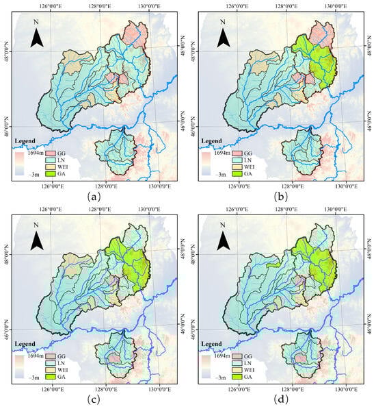Spatial distribution diagram of optimal theoretical distributions of different flood extremum considering precipitation covariates. (a) Optimal models of Q, (b) optimal models of W1, (c) optimal models of W3, (d) optimal models of W7.