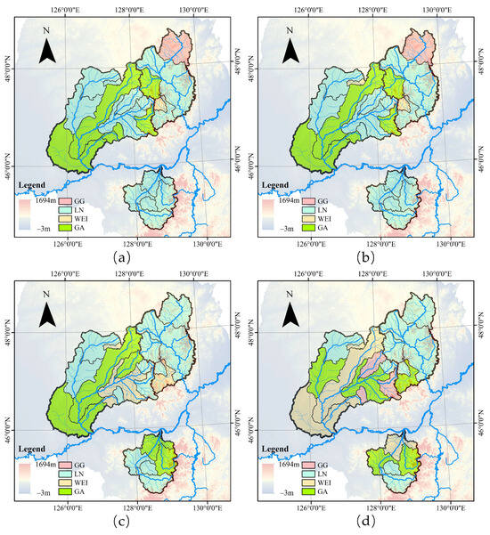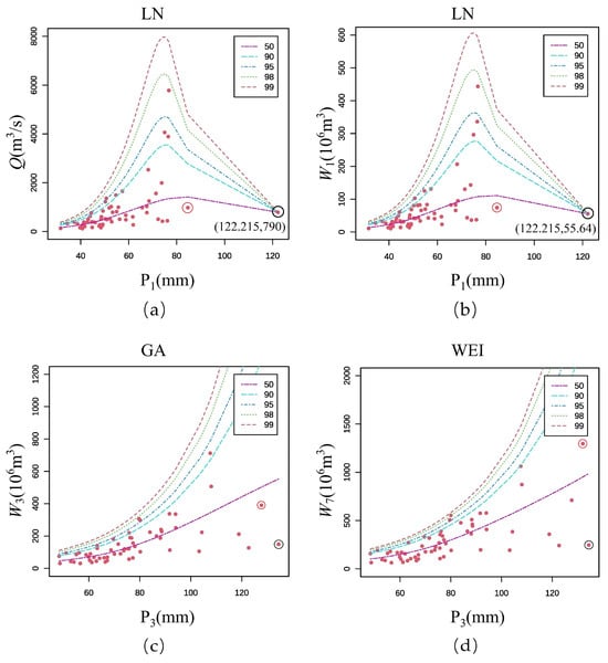 Figure 5 shows the centile curves of the four flood characteristics and precipitation-covariate GAMLSS at Lianhua Station. From this figure, it is shown that with the increase in the precipitation data value, the flood characteristic value has an overall upward trend. However, the shape of the centile curve is greatly affected by the values of the abnormal points, and Lianhua Station is still taken as an example. We find that the abnormal values occur in two models, Q and W1, and not in W3 and W7. It is seen that the covariate of the models Q and W1 is P1, and that of W3 and W7 is P3, and we analyze the generation of abnormal states from the covariate point. The black circle in Figure 5a,b demonstrates that the abnormal point value of the P1 sequence at Lianhua Station is larger (122.215 mm), but the corresponding flood feature sequence value is smaller (790 m3/s, 55.64 × 106 m3), and the red circle in Figure 5a,b shows that the second-largest point of the P1 sequence value corresponds to a smaller flood characteristic as well. The year of occurrence of the P3 maximum point in the W3 and W7 models is the same (1966) as the year of occurrence of the P1 maximum point in the Q and W1 models. However, the red circles in Figure 5c,d show that the flood characteristics corresponding to the second-largest value point of the P3 sequence are much larger than those corresponding to the maximum value point, which is different from the models of Q and W1 in Figure 5a,b, where the maximum point in P1 leads to an abnormal downward trend in the second half of the centile curve of the precipitation-covariate GAMLSS and finally converges to this point. The abnormal point occurred in 1966, which is in the measured period of the sequences, and our data were extracted from the yearbook, which has high data reliability. Therefore, we did not process the data for the measured period before calculation, which led to the abnormal situation. This is also a reminder that variable–covariate correlations should be analyzed before model calculation and that outliers should be excluded in advance based on the historical situation to avoid the effect of abnormal data on the model calculation result. Based on the centile curve calculation results of all stations, it can be found that when the 90% quantile is selected, the deviation between the theoretical quantile frequency of the Tangwang River and the measured point frequency is the smallest, ranging from −5.0% to 3.4%. It is followed by the Mayi River basin, for which the deviation range is −7.4~2.5%. The largest deviation occurred in the Hulan River basin, which ranged from −9.6% to 5.7%. Compared with the time-covariate GAMLSS, the deviation range of the precipitation-covariate GAMLSS is slightly larger. The main reason may be the introduction of precipitation uncertainty information when the model is calculated with precipitation as a covariate. In the case of the time-covariate model, most of the data are measured. The occurred time, intensity, and flood characteristics of historical flood data have been verified by flood investigations, and the uncertainty is small. However, the situation for precipitation covariates is very different. The strength of the correspondence between precipitation data and floods, whether a single precipitation event can perfectly match each corresponding flood event, and the uncertainty of historical rainstorm data are greater. It is easy for abnormal points to affect the overall deviation. However, considering the above situation, the deviation of the simulation results is within a reasonable range. The spatial distribution of the optimal theoretical distribution of the GAMLSS preferences for different extreme flood characteristics at each station with precipitation as a covariate is shown in Figure 6.