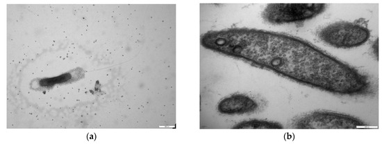 Cells of strain 09-MeT were straight or slightly curved rods, 0.6–3.5 μm in length and 0.25–0.35 μm in width. They were present singly, in pairs, rosettes, or aggregates, and formed biofilms; they were motile in the exponential growth phase by means of flagella (Figure 1a). Ultrathin sections of the cells revealed a Gram-negative cell-wall type (Figure 1b). The pellets of cells grown under aerobic or anaerobic conditions had a pinkish or white color, respectively. Under microaerobic conditions in agarose-solidified modified Pfennig medium, strain 09-MeT formed small (1–1.5 mm), circular, pinkish-orange, submerged colonies during two weeks of incubation at 47 °C.