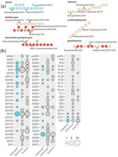 The first cultivated representative of the Melioribacteraceae family, Melioribacter roseus, utilizes a wide spectrum of polysaccharides [2] and possesses a large number of glycosidases encoded in its genome [52]. However, the novel strain 09-MeT, which belongs to Melioribacteraceae, shows weaker hydrolytic capabilities. The comparison of the CAZymes’ repertoires allowed to decipher the differences in the substrates used for growth (Table S2, Figure 3b). Alpha-glucans such as starch and dextrin are hydrolyzed by three alpha-amylases, three neopullulanases and pullulanase of the GH13 family, and alpha-glucosidase of the GH31 family (Figure 3a). Strain 09-MeT utilizes lichenan through the action of four beta-glucosidases (GH3) and three beta-glucanases (GH16). Depolymerization of curdlan and pachyman can occur under the action of the same enzymes together with a beta-1,3-glucanase (GH148). Locust bean gum and guar gum, both chemically galactomannans, are degraded under the action of endo-1,4-beta-mannosidase of the GH5 family, hydrolyzing the mannan backbone and alpha-galactosidase of GH36, which is active against side chains. On the other hand, these endo-1,4-beta-mannosidases may also hydrolyze glucomannan, but not mannan. Depolymerization of xanthan gum in strain 09-MeT probably occurs under the action of two endoglucanases (GH5 and GH9 families), three alpha-mannosidases (GH92 and GH125 families), and three beta-glucuronidases (GH2); however, beta-mannosidases or xanthan lyases genes are absent. Despite an inability to grow on chitin, a putative endochitinase from the GH18 family and four beta-hexosaminidases (GH3 and GH20 families) are encoded in the strain 09-MeT genome. Putative xyloglucanase of the GH74 family has unknown function because strain 09-MeT does not grow on xyloglucan.