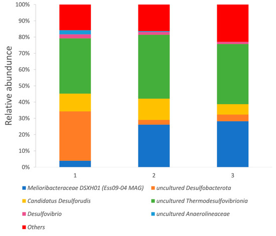 The relative abundance of prokaryotes at the genus level in water samples collected from well 9 of the YMWD. (1): Based on 16S rRNA gene profiling of the sample collected in September 2020 at maximal water flow through the well; (2): based on 16S rRNA gene profiling of the sample collected in November 2020, after 2 months of water stagnation in the well; (3): based on the relative abundance of taxa according to metagenomic analysis of the sample collected in November 2020, using the same sample as (2).