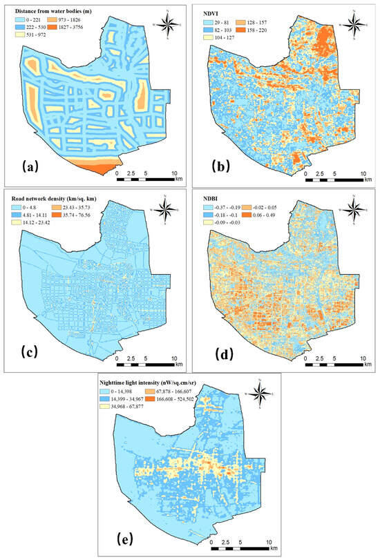 Distance from water bodies (a), NDVI (b), road network density (c), NDBI (d), nighttime light intensity (e).