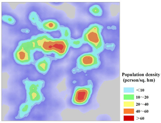 The severity of urban waterlogging is closely related to population density. The greater the population density, the greater the number of people affected by waterlogging directly from the disaster [37]. Heat maps use the acquired mobile phone base station to locate the number of users in the area and render the map color by the number of users. The color of the heat map is determined by the number of people, indicating the level of population density in a certain area. Census data are utilized to record and analyze projections regarding the growth and distribution of the current population across different locations. To establish a quantitative relationship between the two, this paper uses population density in different periods to reflect the dynamic characteristics of the waterlogging indicator based on the real-time heat map of population aggregation. It uses China’s Seventh Population Census 2020 data to expand the vectorized grid population to quantify population density. The specific process is as follows [38,39]: