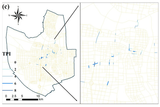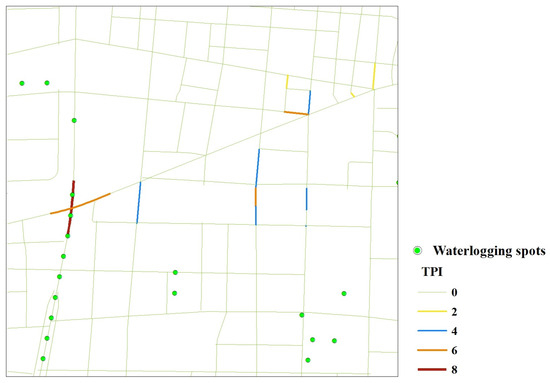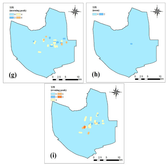 This study uses the traffic road condition map to reflect vehicles’ spatial and temporal distribution characteristics. The captured Amap of road condition data of three weekday periods are processed by GIS and then superimposed on the historical waterlogging spots. The TPI results are shown in Figure 8. Only localized areas are shown in the figure, and the TPI of the non-displayed sites are all zero.