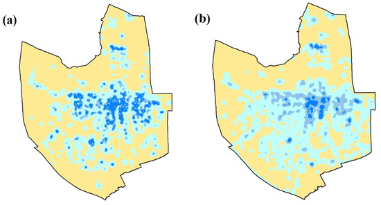 In this study, the population density data obtained through GIS processing are categorized into five classes according to the size of the image element value using Jenks. The color warm and cold reflects the crowd gathering high and low [36] to obtain the central urban area of Suqian City’s morning and evening peak and noon period of the spatial distribution characteristics of the crowd, as shown in Figure 7.