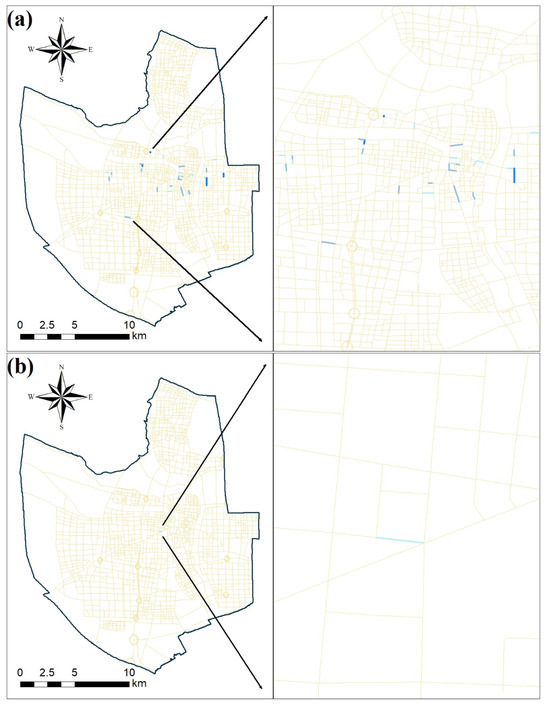 As can be seen from the figure, severe congestion during peak hours mainly occurs in Yingbin Avenue, Xihu Road, Development Avenue, Yellow River Road (the four roads through the superposition of the historical waterlogging spots), Development Avenue, and Xihu Road intersection in the waterlogging spots, and in the range of severe congestion. Hence, the risk of this place is higher, and we need to pay attention to it. Comparing the peak period to noon, the congested road section at noon is 0, and there is only one slow road. In contrast, the packed road section in the morning and evening peaks has 21 and 32, respectively; the risk of exposure is more significant and more attention needs to be paid to it. Based on the range of roads covered by waterlogging, as shown in the literature collection and simulation results, the road buffer zone is set to 300 m [48,49].