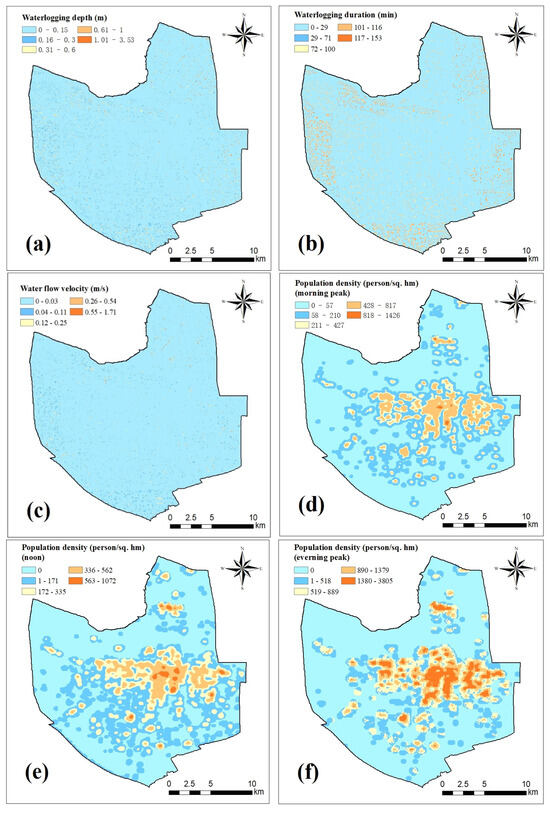 The waterlogging depth, waterlogging duration, water flow velocity, population density, and TPI in the indicator system are numerically calculated, and the spatial distribution of the five indicators is shown in Figure 9. It is presented as a raster map in the GIS with a 30 m × 30 m scale.