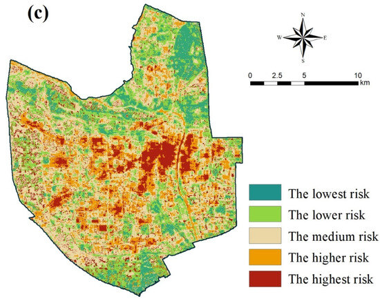 Distribution of waterlogging risk in the central urban area of Suqian City: morning peak (a), noon (b), evening peak (c).