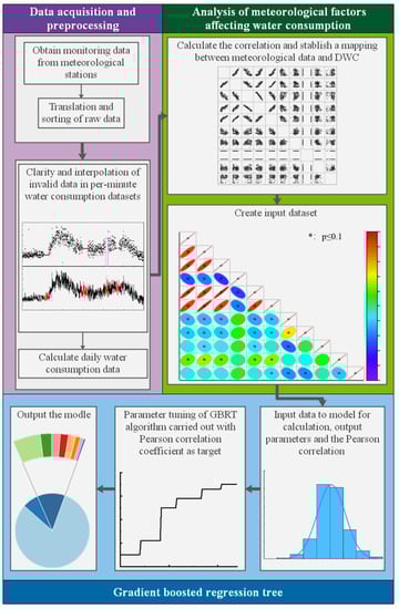 This chapter primarily consists of the following three sections: 1. data acquisition and preprocessing; 2. analysis of meteorological factors affecting water consumption; 3. gradient-boosted regression tree (GBRT).