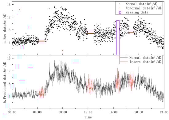Following the removal of abnormal data, missing data are interpolated to accurately restore water consumption variations within the community. Hot deck interpolation method is utilized, which accounts for statistical laws to ensure accurate data interpolation. This data interpolation method was proposed by Li et al. [20] in 2019. The water consumption data after data cleaning and interpolation is shown in Figure 2b. Upon comparing Figure 2a,b, it is evident that data processing resulted in the removal of noise that was characterized by data fluctuations well above the normal threshold for water consumption. Furthermore, after interpolating the original data, the trend of the interpolated data was consistent with the original data’s trend, and its fluctuation pattern followed the probability distribution of the original data.