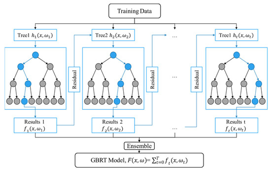 Gradient boosting is a machine learning technique used for regression, classification, and sorting tasks, and is part of the boosting algorithms family [26]. The gradient boosting algorithm builds a learner that can reduce the loss along the direction of the steepest gradient at each step of the iteration to make up for the deficiencies of the existing model. The classic AdaBoost algorithm can only handle two-class learning tasks using exponential loss functions, while the gradient boosting method can handle various learning tasks (multi-classification, regression, ranking, etc.) by setting different differentiable loss functions, which greatly expands the scope of application of the algorithm [27]. The gradient boosting algorithm uses the negative gradient of the loss function as the residual fitting method. If the basis function is a regression tree, a gradient boosting regression tree (GBRT) is obtained.