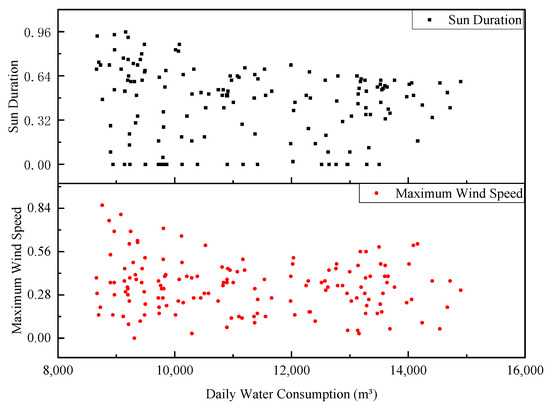 Previous studies have shown that meteorological factors can have an impact on the use of air conditioners during summer and electric heaters in winter [21]. This fluctuation in electrical load can be attributed to changes in weather leading to changes in human comfort. Numerous researchers in the field of power grid have conducted significant research on this issue. Therefore, changes in meteorological conditions result in changes in human water use, which can be analyzed and predicted based on the same meteorological factors. Wind speed, air pressure, and sunshine duration also affect water usage by influencing human perception.