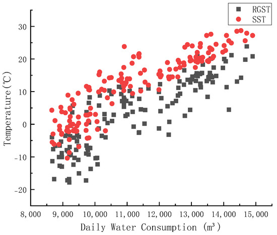 Zhang et al. established a short-term daily water consumption prediction model based on time factors and previous water consumption to scientifically predict urban daily water consumption [6]. Pacchin et al. established a model for predicting water consumption within a 24 h time window based on previous water consumption, which uses only one pair of coefficients whose values are updated at each prediction step [7]. Bruntan et al. proposed three methods of generating comprehensive water consumption time series from observation data based on time series, thereby producing the final consumption in different ways [8]. Roper et al. used weather factors as variables to analyze water consumption in the Boston metropolitan area and found that weather factors had a significant impact on water consumption [9].