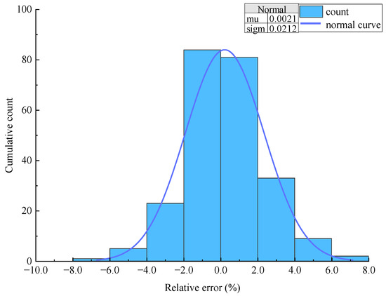 Take 90% of the monitoring data as the training group and the remaining 10% as the test group. The Pearson correlation coefficient of the training group obtained by the GBRT algorithm is 0.987, and the Pearson correlation coefficient of the test group is 0.971. It can be seen that the algorithm does not have the problem of overfitting. Figure 8 shows the relative error between predicted and actual values. It can be found in Figure 8 that the relative error of all predicted values and actual values is of 8%, and the mean relative error is 1.68%. Among them, the predicted value error of ±2% accounted for 66.53% of the total, and the error of ±4% accounted for 83.54% of the total.
