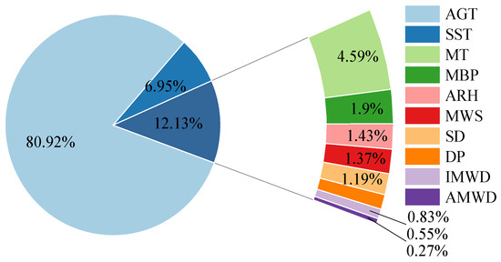 Figure 8 is the graph of feature importance percentages, it can be found that the feature importance of average ground temperature accounts for 81% of the total, followed by somatosensory temperature (7%), minimum air temperature (5%), and minimum barometric pressure (2%). Observing Figure 9, it can be found that, after removing the influence of the average ground temperature, the feature importance of somatosensory temperature is the highest, accounting for 36% of the total, which is followed by the lowest temperature (24%), the minimum barometric pressure (10%), the average relative humidity (8%), maximum wind speed (7%), sunshine duration (6%), daily precipitation (4%), wind direction of instantaneous wind speed (3%), and wind direction of mean maximum wind speed (2%).