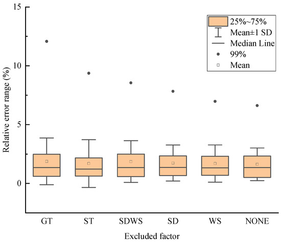 The necessity of incorporating meteorology factors into the daily water consumption prediction model was analyzed by excluding GT, ST, SD, and WS as influencing factors and calculating the relative errors of the models with these factors excluded. Subsequently, the relative errors have been analyzed, and Figure 10 was created to display the results. Removing these factors will bring greater error and uncertainty to the forecast. The boxes depicted in the box diagram have been arranged in descending order based on their degree of influence on the predicted outcomes after controlling for the effects of the considered factor. Among all the factors, GT has the most significant influence on the prediction of the model. Omitting GT from the predictor variables results in a maximum prediction error of 12.6%, which is 4.6% higher than that obtained with the full model. These findings demonstrate that incorporating GT significantly enhances the model’s accuracy. Furthermore, when excluding WS and SD, the maximum relative errors increase by 0.46% and 1.25%, respectively, whereas the exclusion of both factors raises the maximum relative error to 1.61%. The analysis of WS, SD, and daily water consumption reveals that a weak correlation in an individual aspect does not preclude a link between two variables. Such a correlation may appear when the variables interact with other factors.
