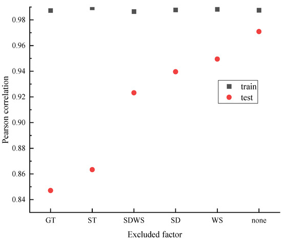 Removing influencing factors significantly affects the model’s fitting performance. Figure 11 shows that GBRT plays a crucial role in enhancing the learning ability of the training group through the boosting mechanism. Irrespective of the factor combinations, GBRT consistently results in a higher Pearson correlation coefficient. However, the Pearson correlation coefficient for the test group significantly decreased when some factors were eliminated. This implies that removing these influencing factors can cause the entire model to underfit.
