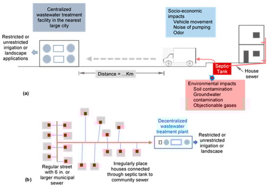 Existing and proposed wastewater management scenarios: (a) septic tanks and wastewater transport to the centralized wastewater system, (b) simplified sewerage system with a decentralized wastewater treatment facility [].