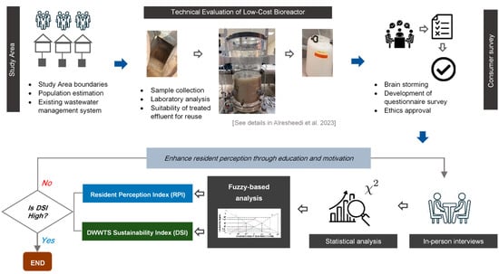The present study intended to evaluate sustainability based on the residents’ perception of the authors’ previously developed low-cost DWWTS for the study area. Figure 3 describes the methodological flow of the research, initiated by defining the study area (Figure 1), followed by an appraisal of the prevailing wastewater management system (Figure 2). We developed and performed a laboratory-scale technical evaluation of a low-cost bioreactor to use as a DWWTS in the study area (see details in Alresheedi et al. []). Through several rigorous brainstorming sessions, we developed a list of demographic factors and perception and sustainability indicators. We defined questions to be asked of the residents to assess each sustainability indicator. In the subsequent phase, we interviewed all the households in the study area to capture their responses against each indicator. Statistical analyses checked the significance of each demographic factor and indicator against the willingness to use the proposed low-cost DWWTS. Finally, we used a fuzzy-based method to assess the resident perception index (RPI) and DWWTS sustainability index (DSI). A higher perception yields higher sustainability of DWWTS in the underlying assumption of the present research. The following subsections give details of each step.