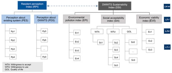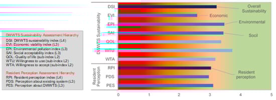 To establish a linkage between resident perception and sustainability of DWWTS, a multilevel hierarchical indicator system was developed, shown in Figure 4. The application of fuzzy synthetic evaluation (FSE) to deal with such multi-criteria and multilevel problems has been proven in the past []. Using fuzzy set theory, FSE can effectively deal with variations and uncertainties in respondents’ opinions. The present study employed FSE to derive the information from survey responses for the resident perception and sustainability indicators defined in Table 2 and aggregated them to obtain RPI and DSI.