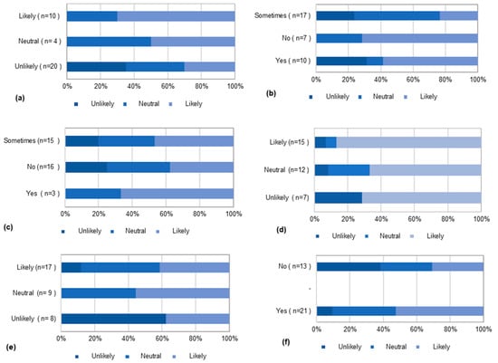 Analysis for descriptive statistics parameters found a strong association between gender and WTA, with all the female (15%) respondents registering likely or neutral responses towards accepting a DWWTS in their area. Education and job type were moderately associated with WTA, while the monthly bill was also strongly associated with WTA. Figure 5 presents the percentage frequencies for each element of UoD, defined in Table 1, for some critical indicators. In Figure 5a, around 50% (20 out of 34) respondents thought that the wastewater generated from their area was unlikely to be treated; nevertheless, 70% of them would be willing to have or were neutral about having a DWWTS. On the contrary, 30% (10 out of 34) of the respondents who were aware of the wastewater treatment were willing to have a DWWTS. These results show an overall positive response from residents toward having a decentralized facility in their small community. Figure 5b illustrates that half of the respondents indicated a neutral response towards the loss of wastewater as a resource, and most (70%) of the 30% of respondents who agreed with this loss had willingness for a DWWTS. These findings reveal that most (80%) of the residents agreed or somewhat agreed that they were losing their wastewater as a resource.