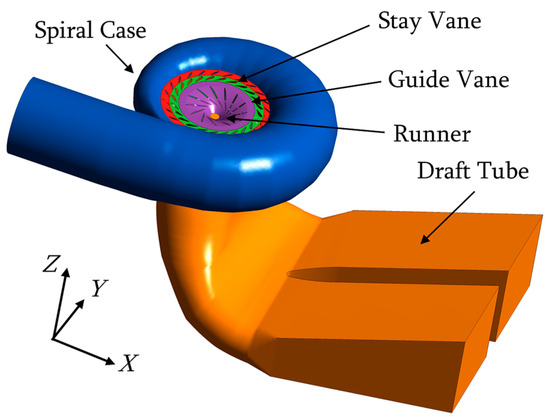 The object of this study was a Francis turbine for a medium head section, and its relevant parameters are shown in Table 1. This Francis turbine had five key flow-passing components: the spiral case, stay vane, guide vane, runner, and draft tube. The runner was a 13-blade Francis runner. The stay vane had 24 blades and the guide vane also had 24 blades. The fluid domain was modeled as shown in Figure 1 for the computational fluid dynamics (CFD) simulation in the following sections. A set of x-y-z coordinates were defined, where z was the runner axis direction, x was the spiral case inflow direction, and y was perpendicular to the x–z plane.