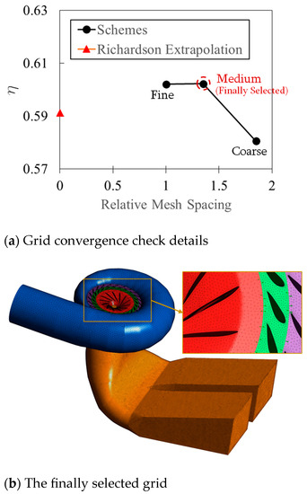 In this study, the commercial software ANSYS CFX was used for CFD simulation. When simulating, the fluid medium was set as water at 20 °C. The pressure reference value was 0 Pa, which means that the simulated pressures were all absolute values. On the basis of the spiral case, stay vane, guide vane, runner, and draft tube, the computing domain connected and transmitted data to each domain through interfaces. The inlet of the spiral case was set as a total pressure-type inlet boundary, with the direction of the inflow perpendicular to the boundary and the pressure in the zero-gradient form. The outlet of the draft tube was set as a static pressure-type outlet boundary, and based on the given pressure value, the velocity was in zero-gradient form. The grid in the computational domain adopted unstructured tetrahedral elements as the main body, and the blade surface was encrypted with prism-type grids to meet the requirements of the wall function. Figure 2a shows the grid convergence check based on the convergence index (GCI) [26]. Three grid schemes following an increasing rate of mesh spacing of 1.35 were checked based on the evaluation of efficiency η. The GCI value of the coarse medium grid was 3.91% and the GCI value of the fine medium grid was 0.03%. After the checking of each component grid, the grid element number was determined, as shown in Table 2 and Figure 2a. The total number of elements was 2.75 million. The schematic map of the grid is shown in Figure 2b.