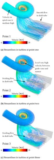 Figure 4 shows the distribution of streamlines in the Francis turbine’s fluid domain representing the turbulence of the flow regime, with colors used to represent the flow velocity. From Figure 4a, it can be seen that, at point one, the flow was smoother due to the operating conditions being near the BER and in the allowed operation region. The flow velocity in the spiral case was also medium-high, with an average of around 10 m/s. The flow regime in the draft tube was very smooth. From Figure 4b, it can be seen that, at point two, due to the condition being in the restricted region, the flow pattern became bad. The flow velocity in the volute decreased to approximately 5~6 m/s. The flow velocity between the guide vane and the runner was extremely high, reaching up to 25~28 m/s. There was a significant twisting flow in the draft tube, which was related to the formation of vortex rope. From Figure 4c, it can be seen that, at point three, the flow pattern became worse as the operating conditions entered the prohibited region. The flow velocity in the spiral case was also relatively low, only about 5~6 m/s. The flow velocity in the area between the guide vane and runner slightly decreased to around 16~18 m/s. There was still a significant swirling flow in the draft tube, which was related to the formation of vortex rope. In general, the flow pattern was strongly related to the operation region. The relationship between flow-induced noise and condition should be analyzed in detail.