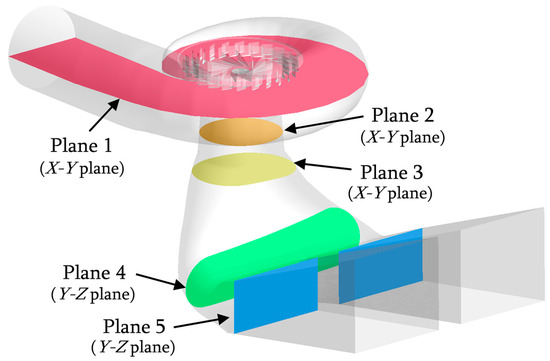 To analyze the specific situation of the flow-induced noise, we created a series of reference planes, as shown in Figure 5. Among them, plane one was the middle section of the spiral case and vane and was an x–y plane. Planes two and three were also x–y planes located in the straight part of the draft tube. Planes four and five were y–z planes in the diffusion part of the draft tube, which was downstream of the elbow part.