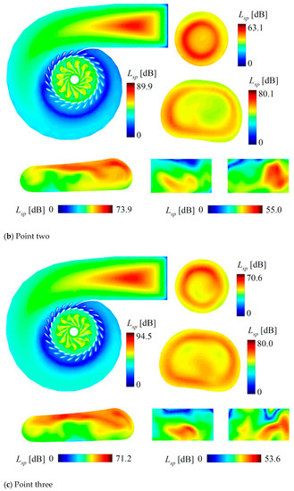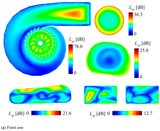 Figure 6a shows the distribution of the sound power level Lsp at the point-one condition. On plane one of the point-one condition, it can be seen that there was an area with a very high sound power level near the inlet of the spiral case. This area was concentrated in the middle of the flow channel and closely related to the compression between fluids. As the cross-section of the spiral case continued to decrease, the sound power level gradually decreased. When the fluid entered the stay vane and guide vane, the sound power level increased. As the fluid entered the runner blade channel and began to interact with the blade, the sound power level reached its maximum value at the inlet edge of the blade, approximately 78.0 dB. At the position near the cone (plane two) of the draft tube, the sound power level gradually rose from the center to the wall up to 36.3 dB. In the middle of the straight section of the draft tube (plane three), the sound power level also showed a gradual rise from the center to the wall up to 25.0 dB. After the fluid flowed through the elbow section, near its position (plane four), the sound power level was higher at the upper wall and lower at the lower wall, reaching a maximum of 21.6 dB. At the diffusion section (plane five) downstream of the draft tube, the distribution of the sound power level showed high levels on the left and low levels on the right without obvious regularity, and the maximum value was 12.7 dB.