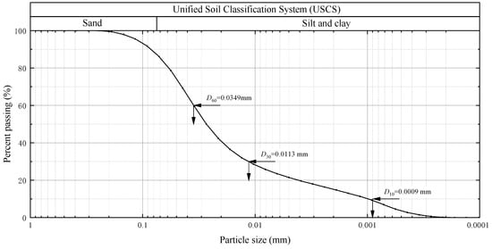The soil sample examined in this study was collected from Yongjing County, Gansu Province, located in the western Loess Plateau of China at coordinates 36°06′35.15″ N and 103°20′11.79″ E. The site belongs to the fourth-level terrace of the Yellow River, and the sampled loess layer is approximately 3 m below the surface. The soil material is identified as Q3 loess (also known as Malan loess in China), which appears yellow in color and exhibits uniform texture, loose structure, and fine particles. The undisturbed dry density of the loess was measured as 1.35 g/cm3 with a moisture content of 7.01%. Following transportation of the soil sample to the laboratory, physical properties were assessed in accordance with ASTM 2006 [] protocols, which are indicated in Table 1. Subsequently, the mineral composition of the loess was examined via X-ray diffraction analysis, presented in Table 2. Based on the soil classification set forth in ASTM D2487, the test soil was categorized as low-plasticity clay (CL). Laser particle size analysis using a Bettersize 2000 instrument was employed to measure the particle size distribution of the loess. Results revealed that the sample comprised 21.42% clay particles (d < 0.005 mm), 70.29% silt particles (0.005 mm < d < 0.075 mm), and 8.29% sand particles (d > 0.075 mm), as illustrated in Figure 1. The maximum dry density obtained from the laboratory compaction test was 1.65 g/cm3, with an optimum moisture content of 15.6%.