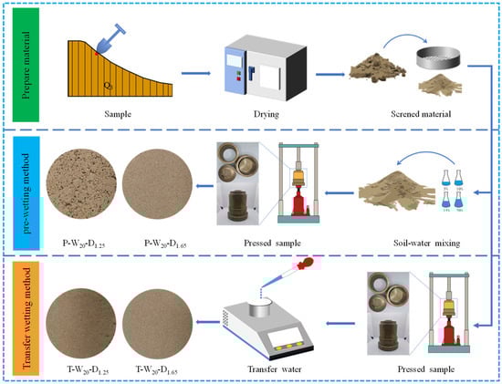 In previous research, a significant number of laboratory experiments have been conducted to investigate the hydraulic properties of loess. Remolded loess samples are commonly used as a means to reflect the hydraulic characteristics of in situ loess and guide engineering activities. The sample preparation process plays a critical role in determining the hydraulic properties of remolded soil samples in laboratory geotechnical tests. For compacted samples, the typical procedure involves drying and pulverizing the soil into a dry powder, which is then sieved to obtain a homogeneous texture. Subsequently, the dry powder is mixed with sprayed water to achieve the desired initial weight moisture content. The moist soil is then compacted under static or dynamic conditions to reach a target dry unit weight (or void ratio). During the rehydration process of the dried soil powder, the formation of aggregates composed of fine soil particles occurs []. Changes in moisture content during the sample preparation process influence the compactness of unsaturated loess and alter particle arrangement, thereby impacting the heterogeneity and permeability of the soil []. The sample preparation method has a remarkable influence on the internal structure of the soil and directly affects the mechanical properties of the samples. Consequently, it is crucial to consider the soil formation process when applying these samples in engineering practice.