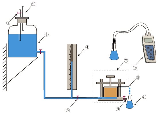 Permeability coefficient test device diagram: (1) inlet; (2) vent; (3) water supply bottle; (4) pressure gauge tube; (5) water stop clamp; (6) exhaust port; (7) permeameter; (8) conical bottle; (9) conductivity meter; (10) outlet.