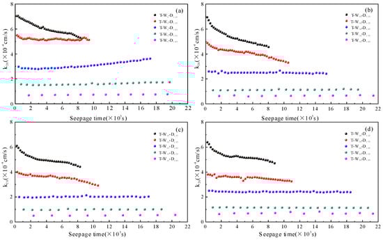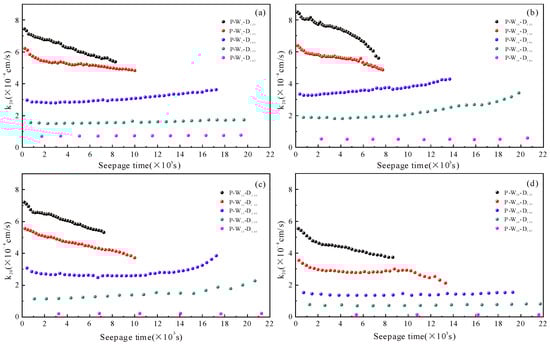 Variation in Permeability Coefficient of Samples with Different Dry Density under Pre-Wetting Method over seepage Time. (a) 5% moisture content; (b) 10% moisture content; (c) 15% moisture content; (d) 20% moisture content.