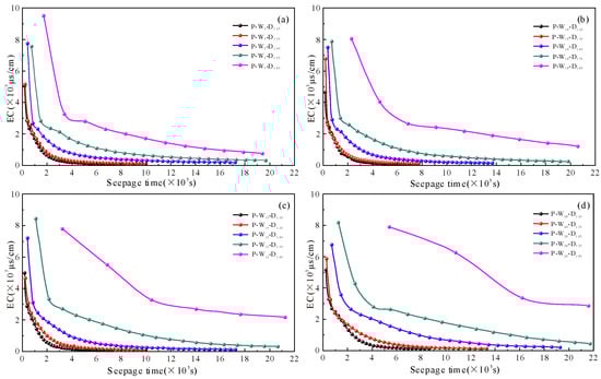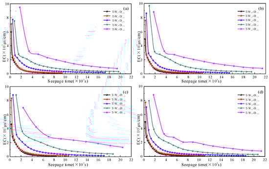 The presence of salt in soil can significantly affect the pore structure, which in turn impacts its permeability []. During experiments, the EC value is a sensitive indicator of changes in salt solution concentration []. Figure 5 illustrates the electrical conductivity changes of the leachate from each sample as a function of seepage time at various water contents ranging from 5% to 20%. The change in EC values can provide a qualitative analysis of the transport of soluble salts in soil with moisture.