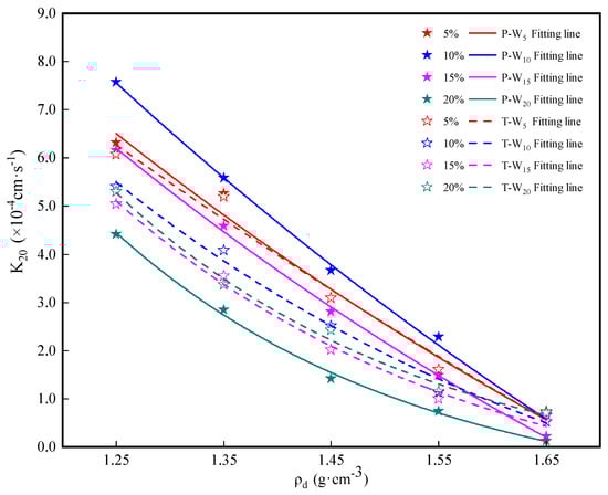 During the seepage, the permeability coefficient of remolded loess undergoes continuous changes. In order to better characterize the relationship between permeability coefficient and dry density of remolded loess, the test results were averaged to obtain the variation characteristics of the permeability coefficient under different sample preparation methods with changes in dry density (Figure 8). The permeability coefficient of remolded loess decreases as the dry density increases, and the decrease in permeability coefficient with increasing dry density is non-linear. The negative exponential function was used to fit the permeability coefficient of remolded loess at various dry density under different water contents, and the fitting results showed that the correlation coefficients were all greater than 0.98. This indicates that the permeability coefficient exhibits a good negative exponential relationship with dry density during the seepage.