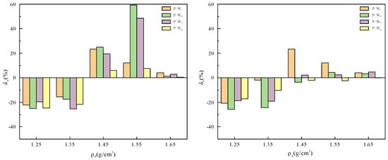 Loess is a material with significant structural performance, and dry density is a commonly used indicator that characterizes the compactness of soil. It is also one of the crucial factors that affect the permeability of compacted loess [,]. Dry density can directly reflect the impact of pore structure compactness on permeability as it is fundamentally determined by the particle skeleton structure’s tightness in the soil [,]. To quantitatively evaluate the degree of change in permeability coefficient with dry density, the increase in permeability coefficient (ΔK) and the relative increase rate of permeability coefficient δK are calculated using the following formulas: