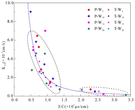The experiment revealed that the concentration of leachate varies significantly under the combined effects of water, soil, and salt. Previous research has shown that the abrupt change in electrical conductivity can partly reflect changes in the internal structure of the soil. By selecting the electrical conductivity values at the point of transition from steep to gentle and their corresponding permeability coefficients for each sample, we constructed the distribution relationship shown in Figure 11. The hydraulic conductivity of soil changes as a result of the interactions between water, soil particles, and chemical substances [,]. Ions in the pore water can cause the dissolution of structural media, altering the pore characteristics and ultimately the soil permeability []. Salt content in the soil changes with the movement of water, and there exists a certain relationship between the electrical conductivity of leachate and soil moisture content, bulk density, and cation exchange capacity, which partly indicates the salt content and its changes in the soil [,]. The pore liquid exists in the soil pores, and the connectivity of pores is affected by the internal structure of the soil, which also impacts the electrical conductivity of leachate to some extent. The experimental soil contains a high content of fine clay particles, affecting the deposition and dispersion of surface substances and influencing the pore structure and surface double layer structure of the soil. Stronger soil permeability corresponds to stronger ion-exchange capacity between the aqueous solution and the soil, and vice versa. Electrical conductivity and permeability coefficients are concentrated in two areas, showing an aggregation trend of low electrical conductivity and high permeability, and high electrical conductivity and low permeability, respectively.