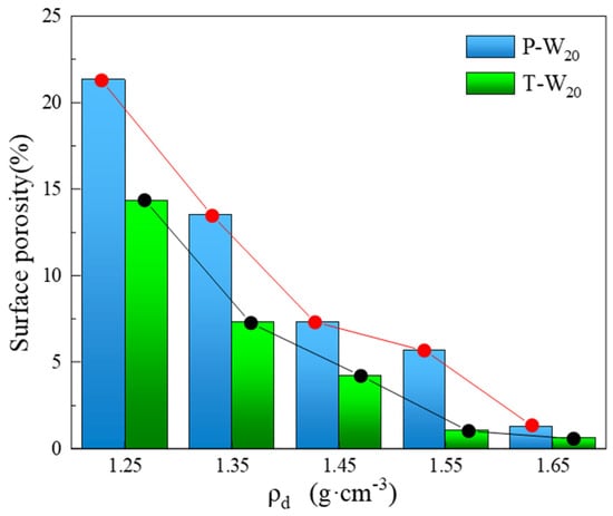 In this experiment, selected samples after seepage were subjected to fine-pore structural analysis. The images captured using the Stemi-508 body microscope were processed and stitched together, and then binarized to extract the pores. The results of the surface porosity of the specimens are presented in Figure 12. It was observed that the surface porosity of samples prepared using the pre-wetting method was higher at the same dry density. As the dry density increased, the surface of the samples tended to become denser, resulting in a reduction in surface porosity. The reduction percentages were found to be 6.97%, 6.16%, 3.125%, 4.66%, and 0.67%. Additionally, the ratio of larger pores in the samples prepared using the transfer wetting method was lower compared to the samples prepared using the pre-wetting method. This indicates that fine pores are more likely to form under the transfer wetting method. Loess has preferential flow based on large-pore channels during seepage [,,]. The pre-wetting method increases the initial bonding degree of the soil, causing it to form more large-pore structures during compaction, indirectly increasing the possibility of preferential flow. Therefore, samples prepared under the transfer wetting method have lower permeability at the same water content and dry density than those obtained under the pre-wetting method.
