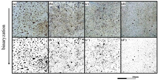 Characteristics of surface pore density variation for samples prepared using different methods (Figure (a): P-W20-D1.35, Figure (b): T-W20-D1.35, Figure (c): P-W20-D1.55, Figure (d): T-W20-D1.55; Figures (a’–d’) show their binarized images).