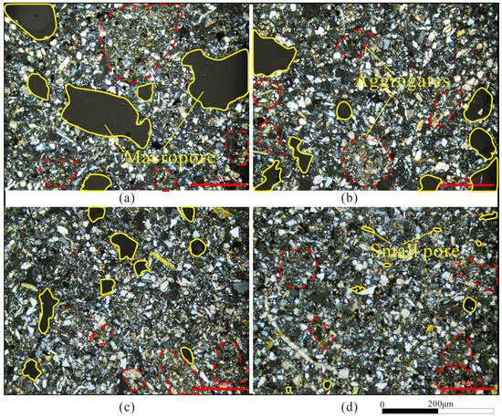 After the experimentation, a meticulous process of curing, polishing, and thin-slice preparation was undertaken for a specific portion of the sample. Subsequently, the prepared slices were subjected to observation under a Nikon polarizing microscope, employing a magnification of 100 times. This carefully chosen magnification not only provided a broad and comprehensive field of view but also rendered the pores and particle boundaries remarkably distinct. Moreover, the cementitious materials and aggregates exhibited excellent discernibility, enabling precise analysis and quantification. The distribution and aggregation characteristics of skeletal particles, agglomerates, and pores in the sample are illustrated in Figure 14. Under the pre-wetting method, the sample exhibits a greater number of large-sized pores, while small-sized pores are interspersed within the larger pore spaces. The skeletal particles are dispersed randomly, with fine particles bonding to form larger agglomerates (Figure 14a,c). Under the transfer wetting method, the sample exhibits fewer large-sized pores, with a predominance of smaller-sized pores. The distribution of skeletal particles appears more uniform, resulting in the formation of smaller aggregates (Figure 14b,d).