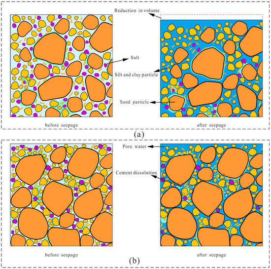 During seepage, low-dry-density soils have larger pore diameters and higher porosity. Once the seepage fluid fills the pores, particles experience buoyancy from the pore water pressure. Under hydraulic pressure, the pores in the soil expand and connect with each other through weak interparticle bonds, forming preferential seepage paths. Long-term seepage causes soil particles to float, altering their positions within the soil. Larger particles are pushed together under the hydraulic pressure, further enlarging the preferential seepage path. Fine particles seep through the soil matrix [,] and gradually move upward. Easily soluble salt particles are carried out of the soil along with the seepage water, increasing the total porosity of the soil. This leads to more-frequent movement of fine particles and gradual accumulation of larger particles at the bottom of the soil, blocking the pores and reducing the soil permeability. This phenomenon causes infiltration subsidence and structural damage to the soil (as shown in Figure 15a). High-dry-density soils have smaller pore diameters and lower porosity during seepage. The flow path remains stable, and the hydraulic pressure does not significantly impact the particle arrangement. The soil can only establish a stable seepage path by connecting some weakly bonded pores under the effect of permeation pressure. Over time, salt particles and some weak bonding materials are eroded by seepage, but the main seepage channels remain stable, and the permeability remains relatively low and constant (as shown in Figure 15b). Therefore, in engineering practice, it is recommended to control the compaction degree as much as possible to ensure that the soil has a high dry density and stable pore structure. This can effectively reduce the risk of structural damage and soil instability caused by seepage-induced geological hazards during water seepage.
