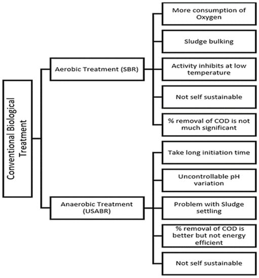 Aerobic treatment requires a sequencing batch reactor (SBR) [23], activated sludge process (ASP) [24], trickling filters, etc. [25,26]. In anaerobic treatment, anaerobic digestors, up-flow anaerobic sludge blanket reactors, etc., are essential [27]. These different biological treatment methods have many issues, as shown in Figure 2. Due to their ability to combine wastewater remediation with bioelectricity generation, microbial fuel cells (MFCs) offer a promising approach. MFCs convert chemical potential directly into electricity, rendering them economical, sustainable, and environmentally favorable [28].