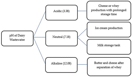 The pH of dairy effluent varies considerably depending on the production of different dairy products. Wastewater from dairy facilities producing whey, cheese, etc., is typically acidic, whereas wastewater from milk and cream products has a pH closer to neutral. Due to the use of detergent and degreasing chemicals, producing a large quantity of butter increases the alkalinity of dairy wastewater. The range of pH of wastewater from various dairy products is shown in Figure 3.
