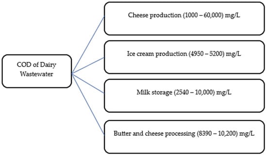 Depending on the quantity of the various dairy products produced, the concentration of carbonaceous substances in dairy wastewater, as measured by COD, varies considerably. The presence of organic matter influences the output efficacy of MFCs significantly. Low levels of organic matter in wastewater result in weak MFC performance. However, increasing organic matter concentration does not always result in improved performance. Each microorganism has an optimal substrate concentration, above which substrate inhibition occurs, creating a suffocating environment for microorganisms. Optimizing the substrate concentration is essential for enhancing the efficacy of MFCs. If dairy effluent contains an excessive organic load that exceeds the optimized value, system performance must be maintained by applying the necessary treatments. The range of COD of the wastewater from various dairy products is presented in Figure 4 [9,32,49,50,51,52,53].